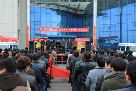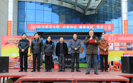 2月7日,农历正月初八上午9点18分,农贸公司办公大楼前广场鞭炮阵阵,群情沸腾。我公司2014年华强复合肥自我加压、增量创利誓师大会和营销人员出征仪式在这里隆重举行,集团公司领导均出席誓师大会。