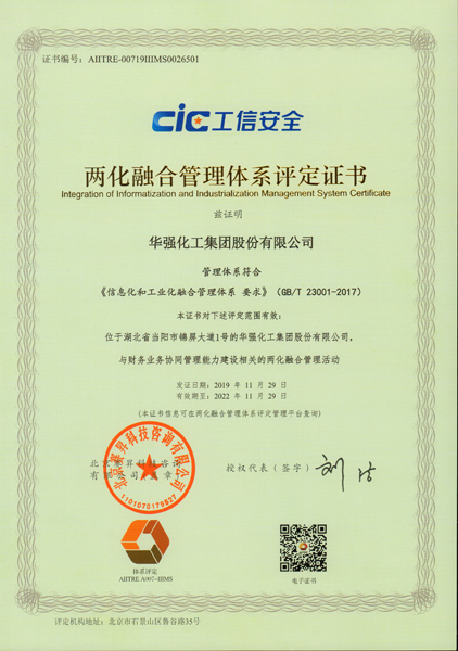 近日,我公司顺利通过国家两化融合管理体系评定认证,并获得两化融合管理体系评定证书,成为符合 GB/T23001-2017 标准的国家级两化融合管理体系贯标企业,标志着华强化工在推进“信息化和工业化”深度融合方面进入了一个新的阶段。 公司将以此次两化融合管理体系评定认证为契机,持续加强与战略匹配的信息化环境下的新型能力,快速推进两化融合进程,通过信息化与工业化的深度融合,为公司打造“信息化+”、实现高质量可持续发展和绿色强企梦想贡献力量。