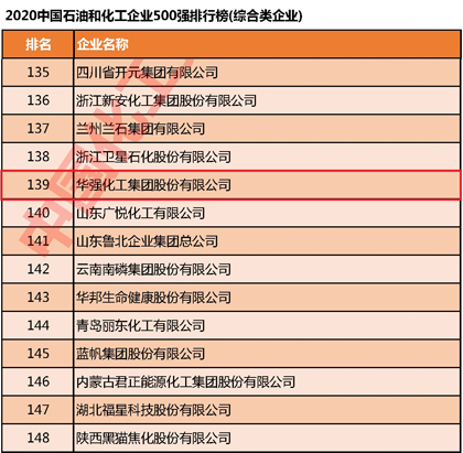 10月20日,2020年“中国石油和化工企业500强发布会暨后疫情时代中国化工大发展对策高峰论坛”以直播形式在线上举行。会上发布了2020中国石油和化工企业500强排行榜,我公司以亮丽的成绩荣登榜单,位列第139名。这是我公司连续 4年入围中国石油和化工企业500强榜单,此外我公司连续多年跻身中国化肥企业100强、中国磷复肥企业100强。